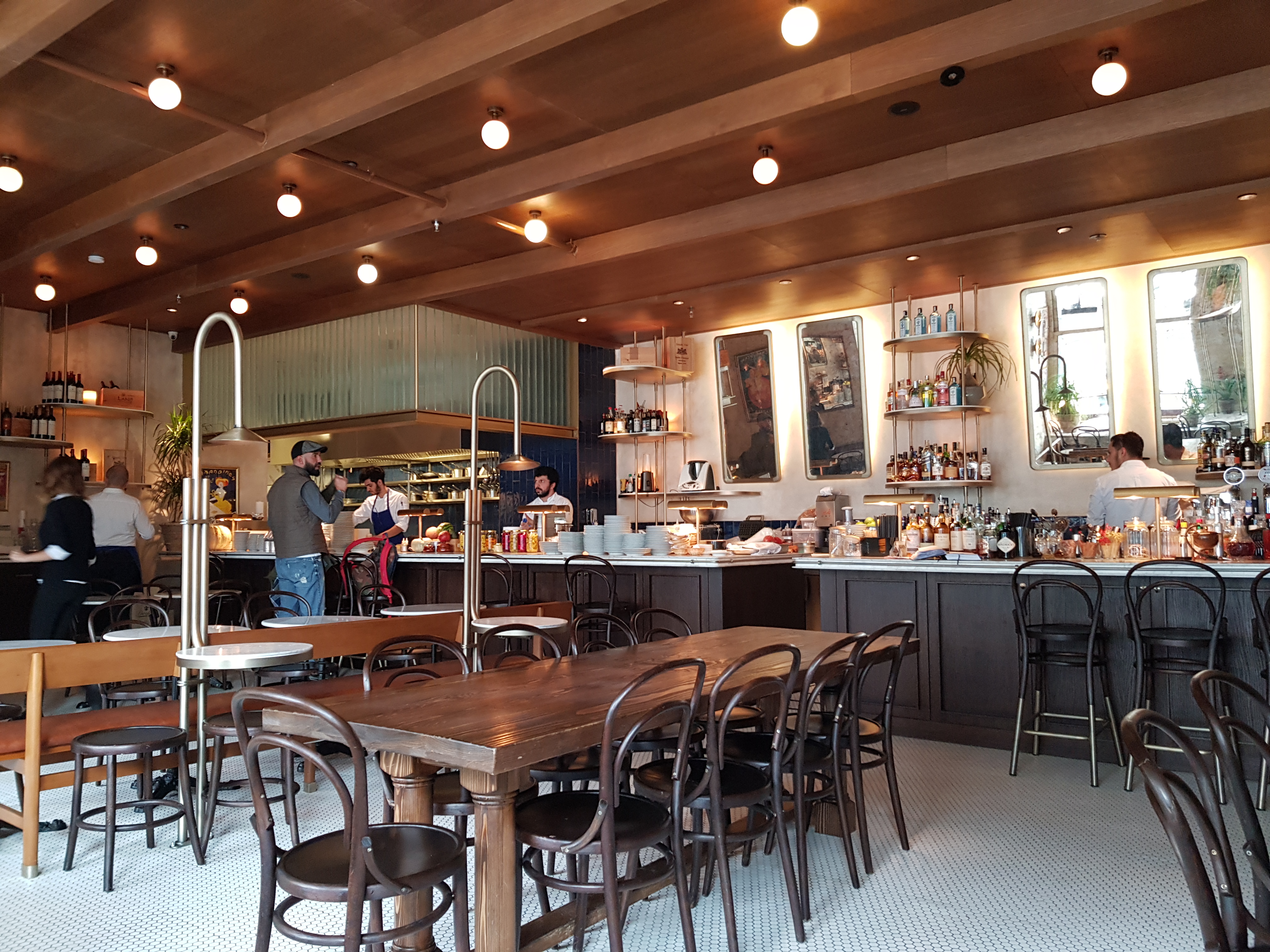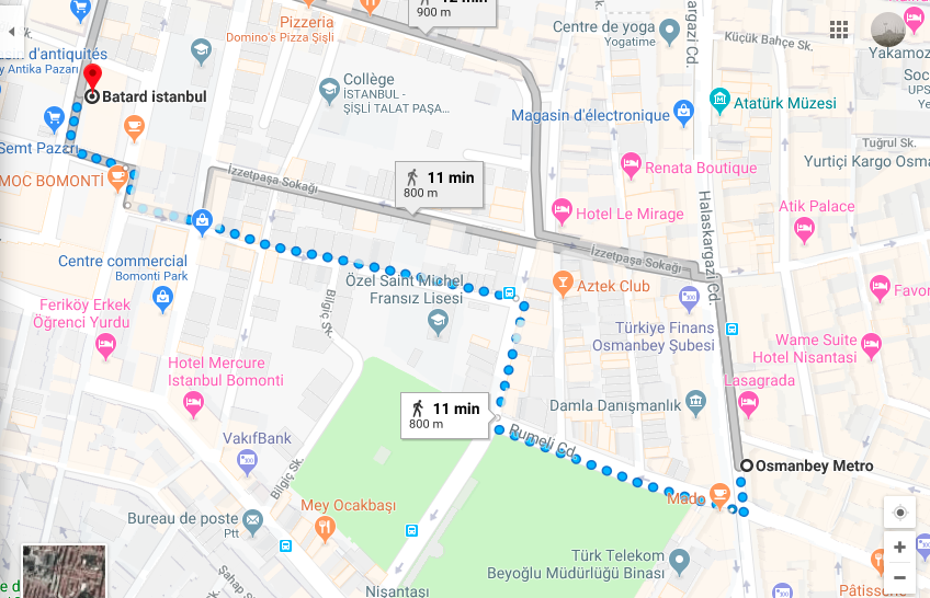 Etrange nom pour ce café à l’ambiance parisienne indubitable. Je n’ai pas osé demandé pourquoi avoir choisi ce nom, mais je le ferai la prochaine fois. Ce café-restaurant ne se trouve pas dans un quartier touristique. Il se situe à Şişli (prononcez chichli), dans une section appelée Bomonti qui devient très tendance, avec de nouveaux restaurants et cafés. Mais il vaut le détour pour son côté très chic et tranquille. J’ai aimé les tables en marbre et fonte qui réhaussent l’atmosphère française. La devanture en bleu roi lui donne tout de suite un côté élégant et on a tout de suite envie de s’y installer. La déco rappelle le côté rétro des cafés parisiens. J’ai adoré les grandes tables pour des rencontres entre amis ou même de travail. Et surtout, un grand comptoir comme je les aime 🙂