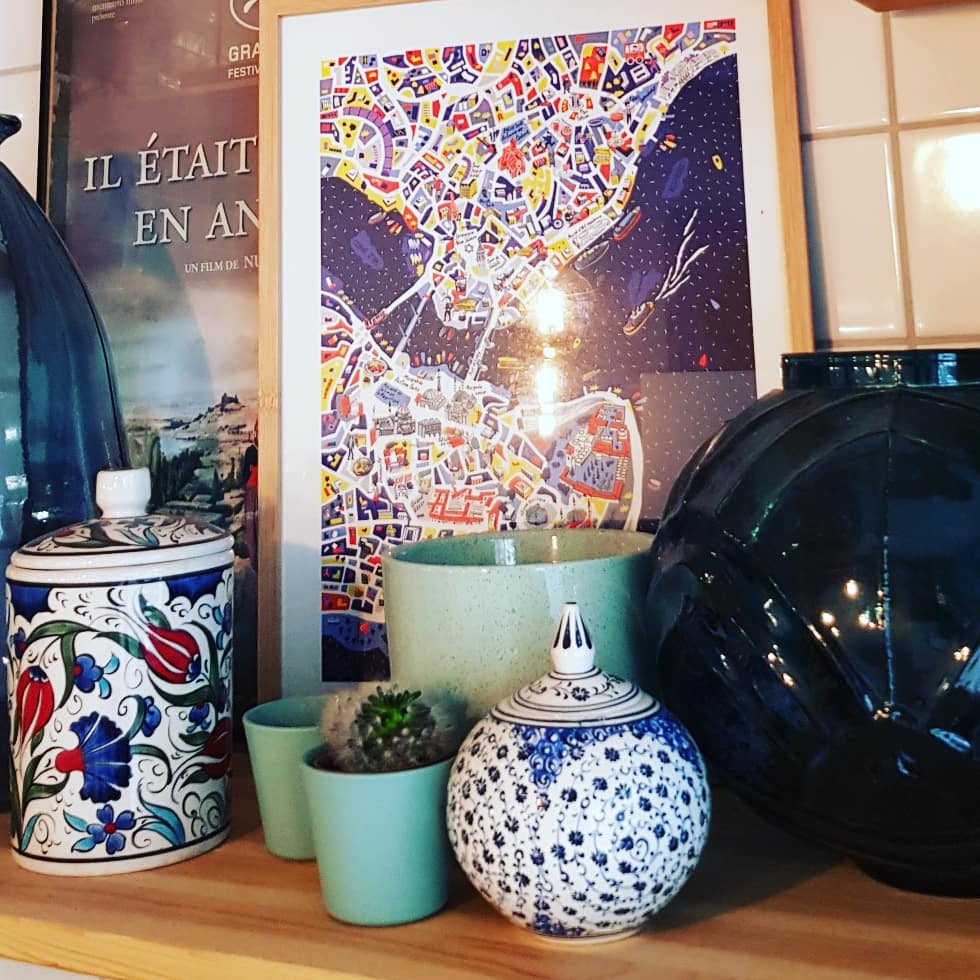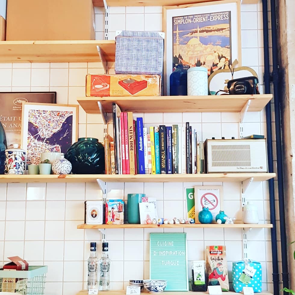 Dès l’entrée, je me suis sentie un peu en Turquie, avec les carreaux de faïence bleu et turquoise sur les murs et le comptoir (le comptoir!!). La vaisselle est dans les mêmes tons et reprend tous les motifs turcs. Une vaisselle et une décoration tout droit venue d’Istanbul, celles qu’on retrouve dans les bazars ou des magasins plus raffinés d’Istanbul. L’ambiance est donc parfaite pour commencer la dégustation!