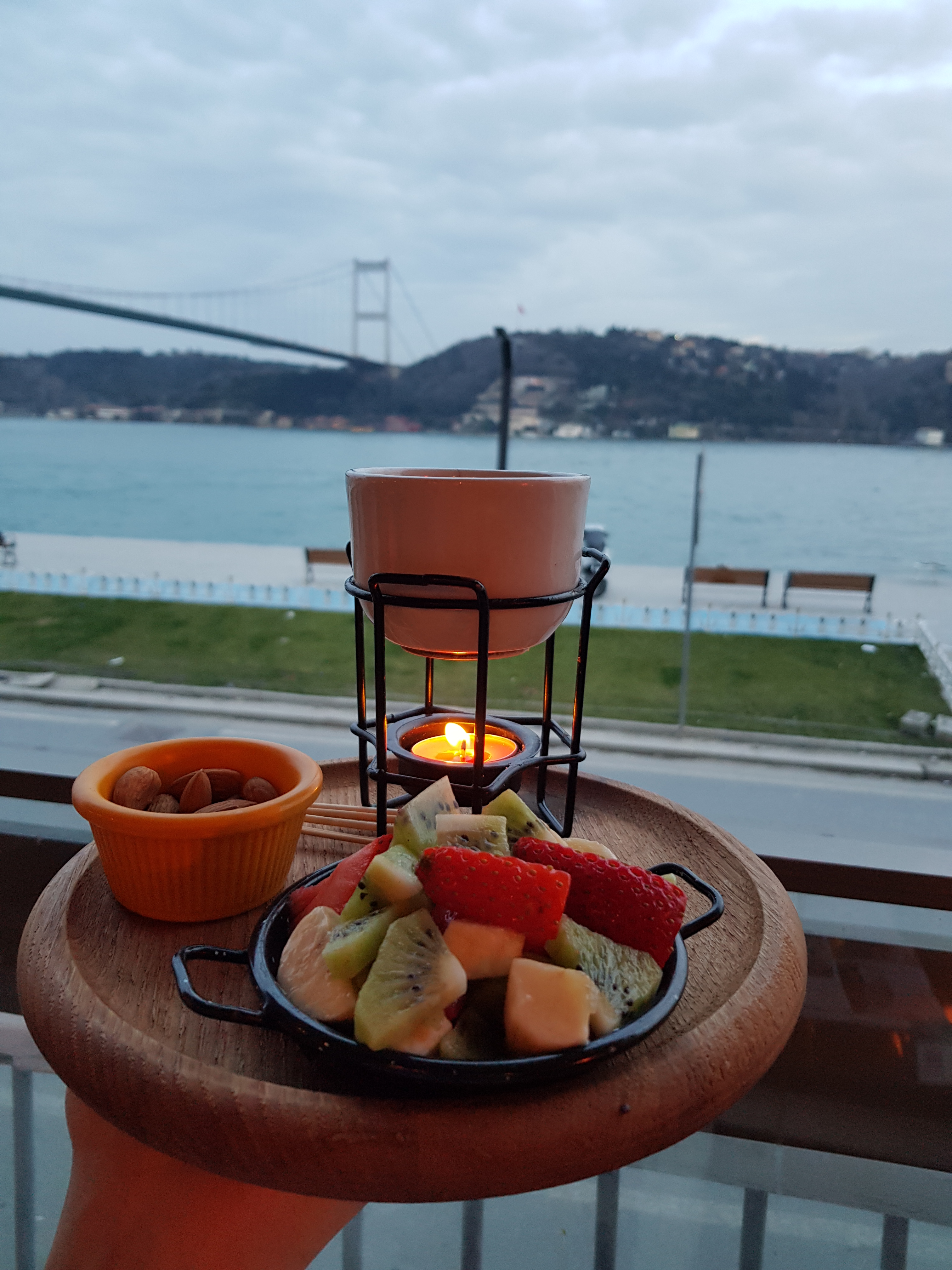 Je vous conseille de vous y rendre au moment du coucher du soleil pour voir les couleurs changeantes du ciel et du Bosphore et… l’illumination du pont. De la terrasse, on voit les gens se promener sur le bord de mer. Pour ce restaurant, le meilleur conseil est PRO-FI-TEZ.