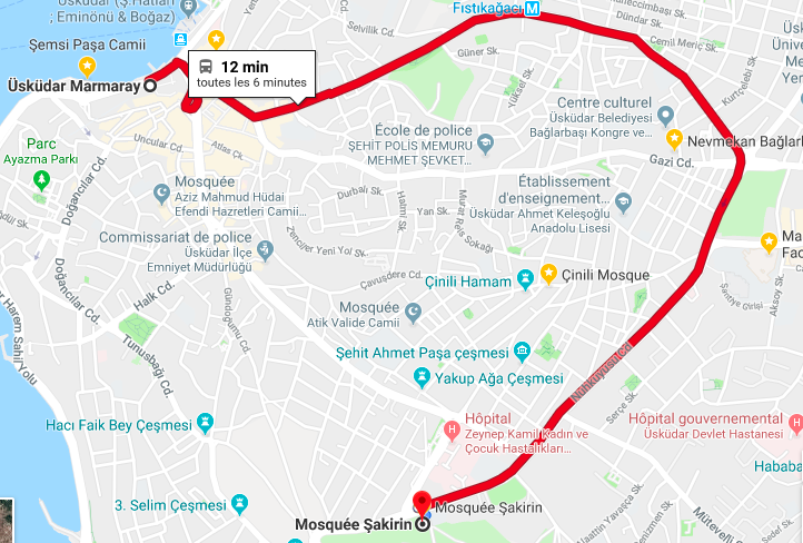 Pour se rendre à la mosquée Şakirin Cami, de la station de métro Marmaray à Üsküdar, prendre le bus 12A ou 12C et descendre à l’arrêt Zeynep Kamil Hastanesi.