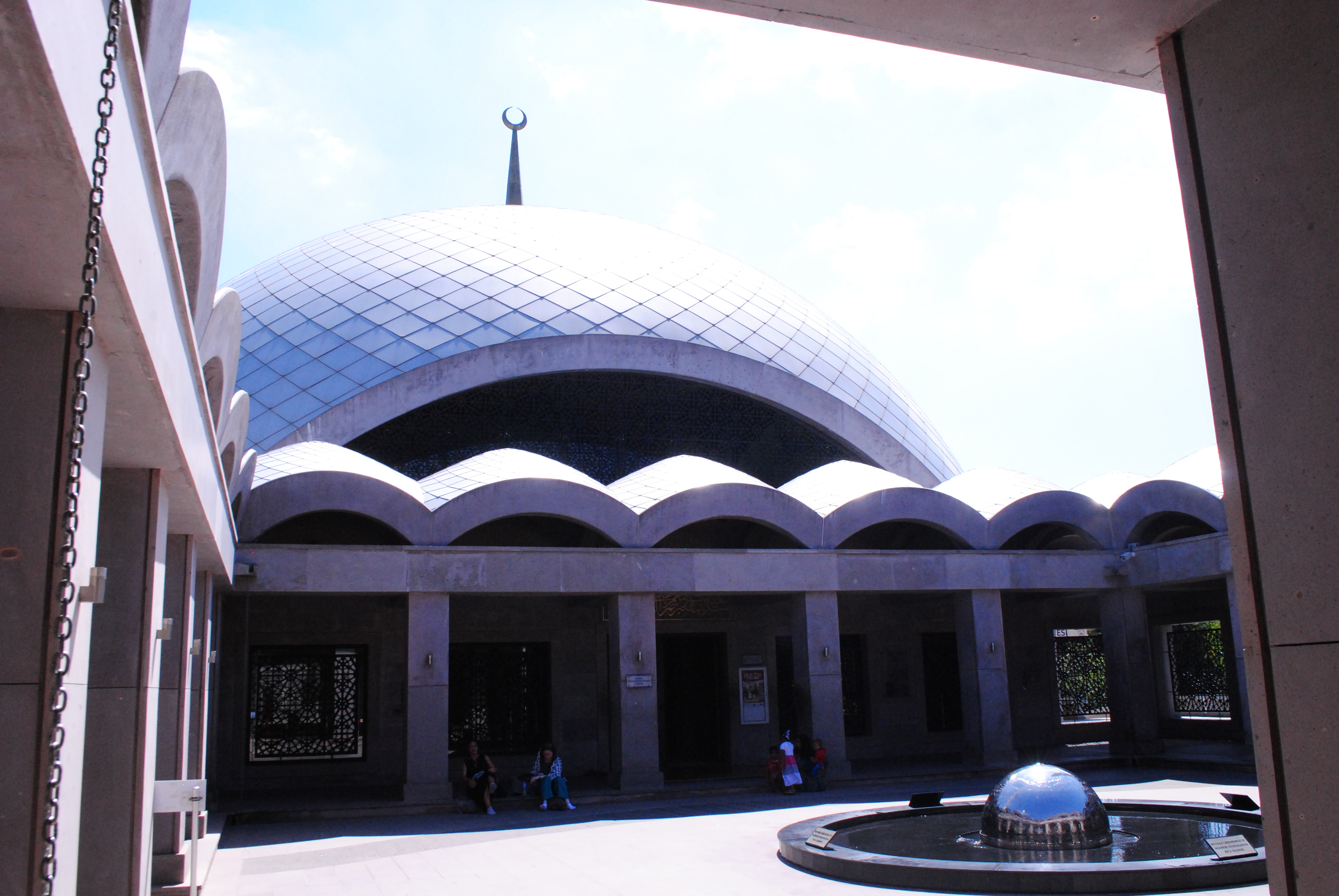 Dans la cour, la fontaine est formée d’une boule métallique sur laquelle glisse l’eau. Et la surface plane fait refléter la mosquée à travers l’eau. On peut rester des heures dans cette mosquée et cette cour tant le calme qui y règne est très différent de l’ambiance des grandes mosquées historiques ou de quartier.