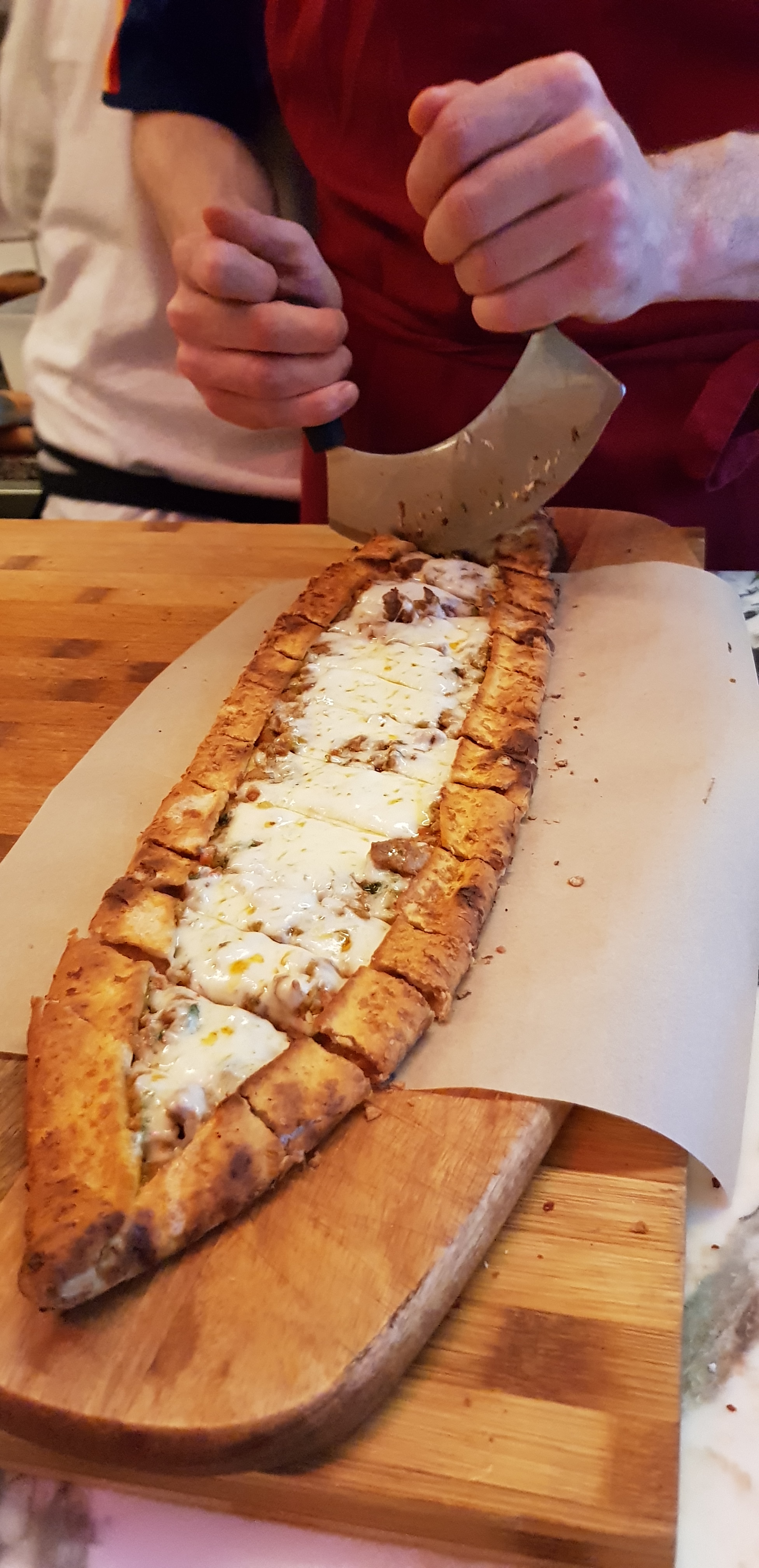 A Paris, un Français d’origine turque a eu l’idée d’ouvrir une petite cantine sympathique en proposant des pide. Güneş (prononcez gunech), Cyril et Eva, avec un grand sourire et une gentillesse naturelle, vous accueillent Rue des Ecuries dans le 10ème arrondissement. Il y en de toutes sortes, avec une petite variante française, à la roquette et feta. Bien entendu, la pide originale est plus huileuse, et garnie. Tellement garnie qu’on ne les finit jamais! Chez Pidè Paris, les pide sont légères et fraîches puisqu’elles sont faites à la commande devant vos yeux. Rien de mieux pour se sentir à la maison. Dès que Güneş sort la pide du four, Cyril dégaine pour la couper en petits morceaux pour faciliter l’engloutissement!